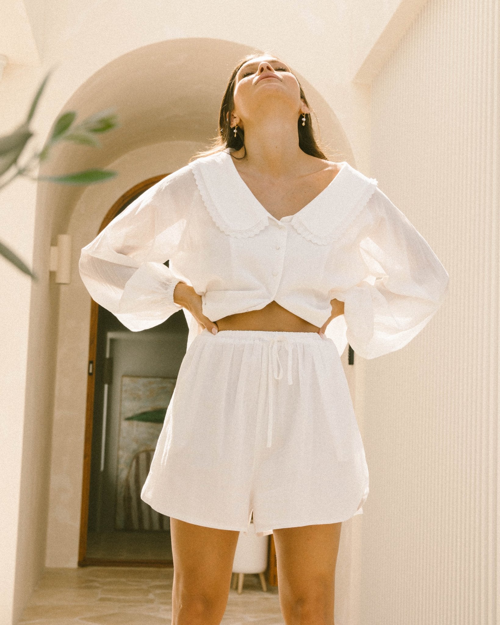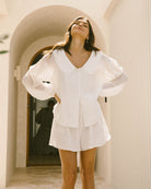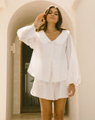 The Haisley Top is a versatile wardrobe staple crafted from 100% cotton for a breathable and comfortable feel. Fully lined for added coverage, it features a crisp white color that pairs effortlessly with any outfit. The delicate collar detail and button-down front add a charming, timeless touch, making it easy to dress up or down. Designed with long sleeves, this top offers lightweight coverage, perfect for transitioning between seasons. Whether styled with matching Haisley Shorts or your favourite denim, the Haisley Top brings easy elegance to your everyday looks.