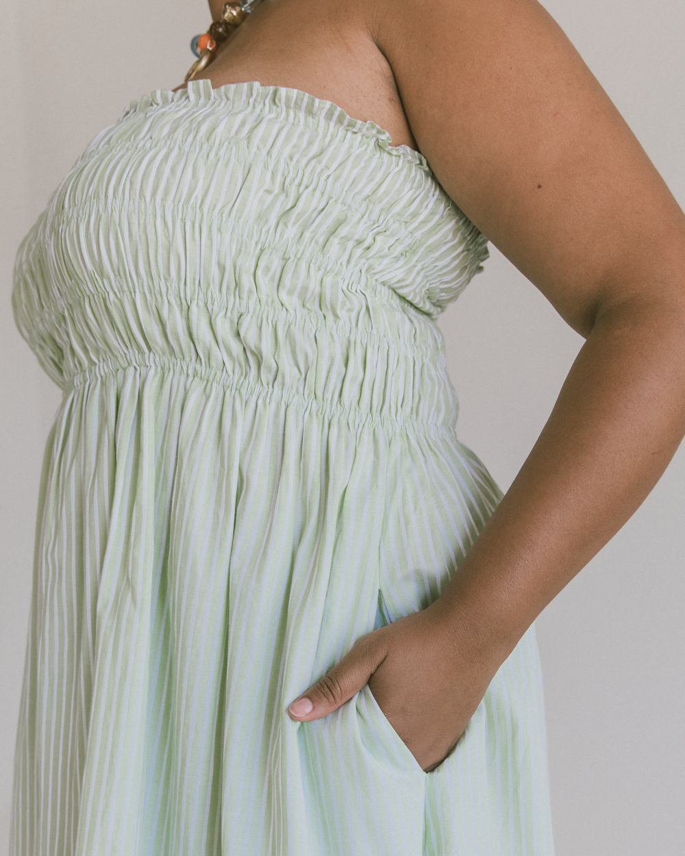 The Mabel Mini Dress is strapless, shirred bust and lightweight with side seam pockets, she’s the easy throw‑on mini you can wear anywhere.