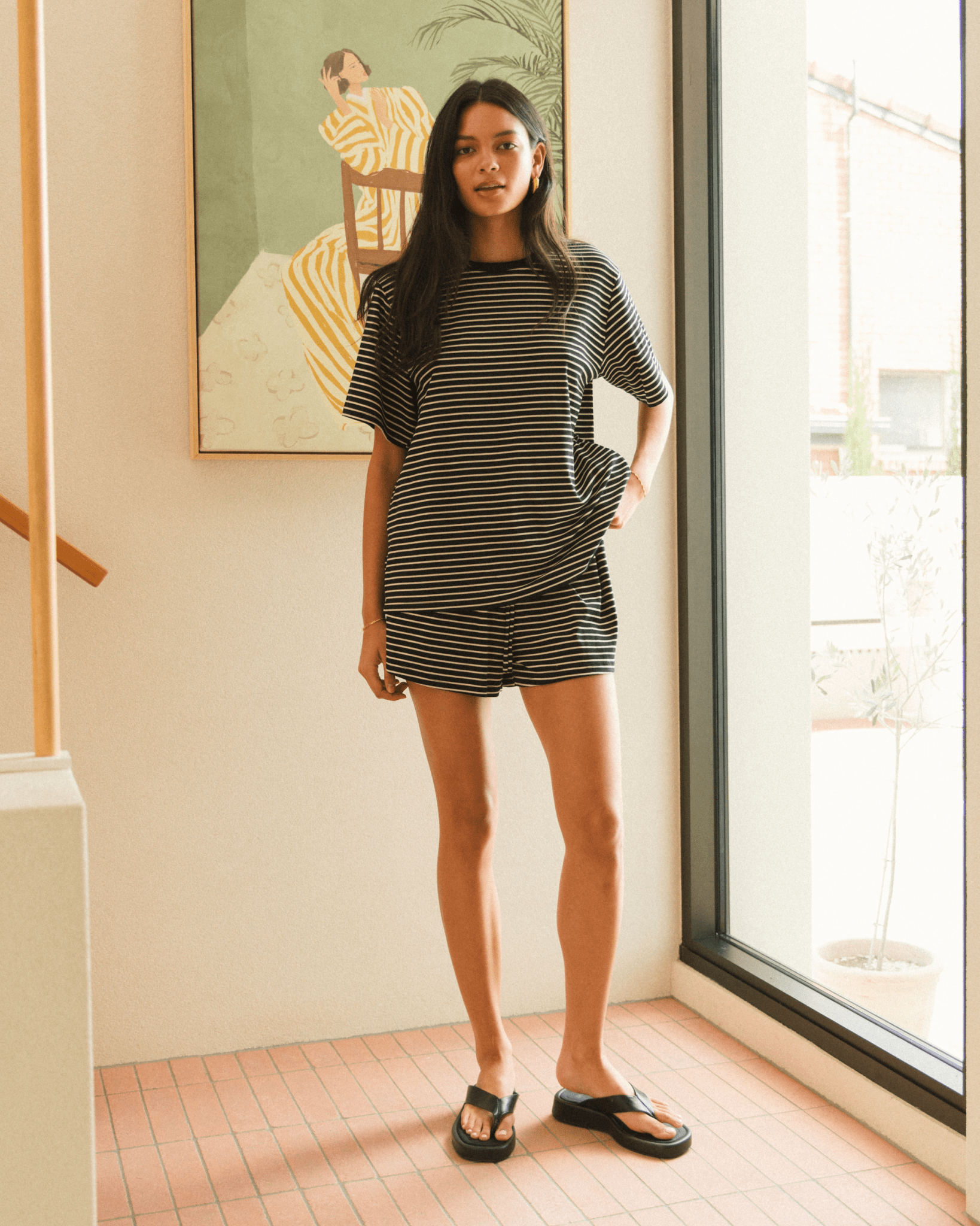 The soft green stripe has that calm, coastal feel and pairs perfectly with the matching tee or shirt for the full set moment. Cute, coordinated and absolutely effortless.