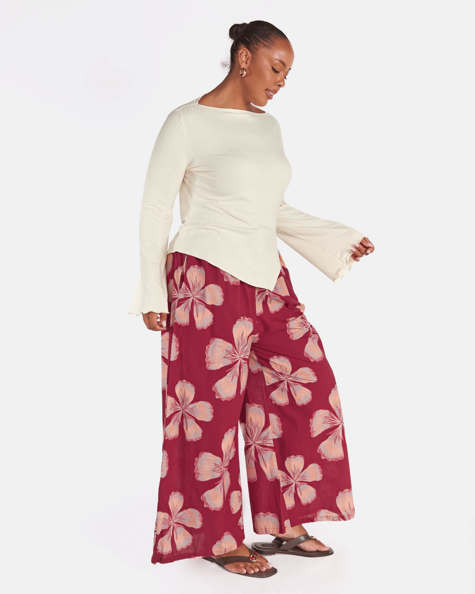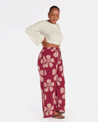 The exclusive Midnight Bloom print showcases oversized hand drawn florals set against a rich maroon background. Soft peach and blush tones bloom across the fabric, creating a warm, bold statement that still feels effortless and wearable.