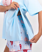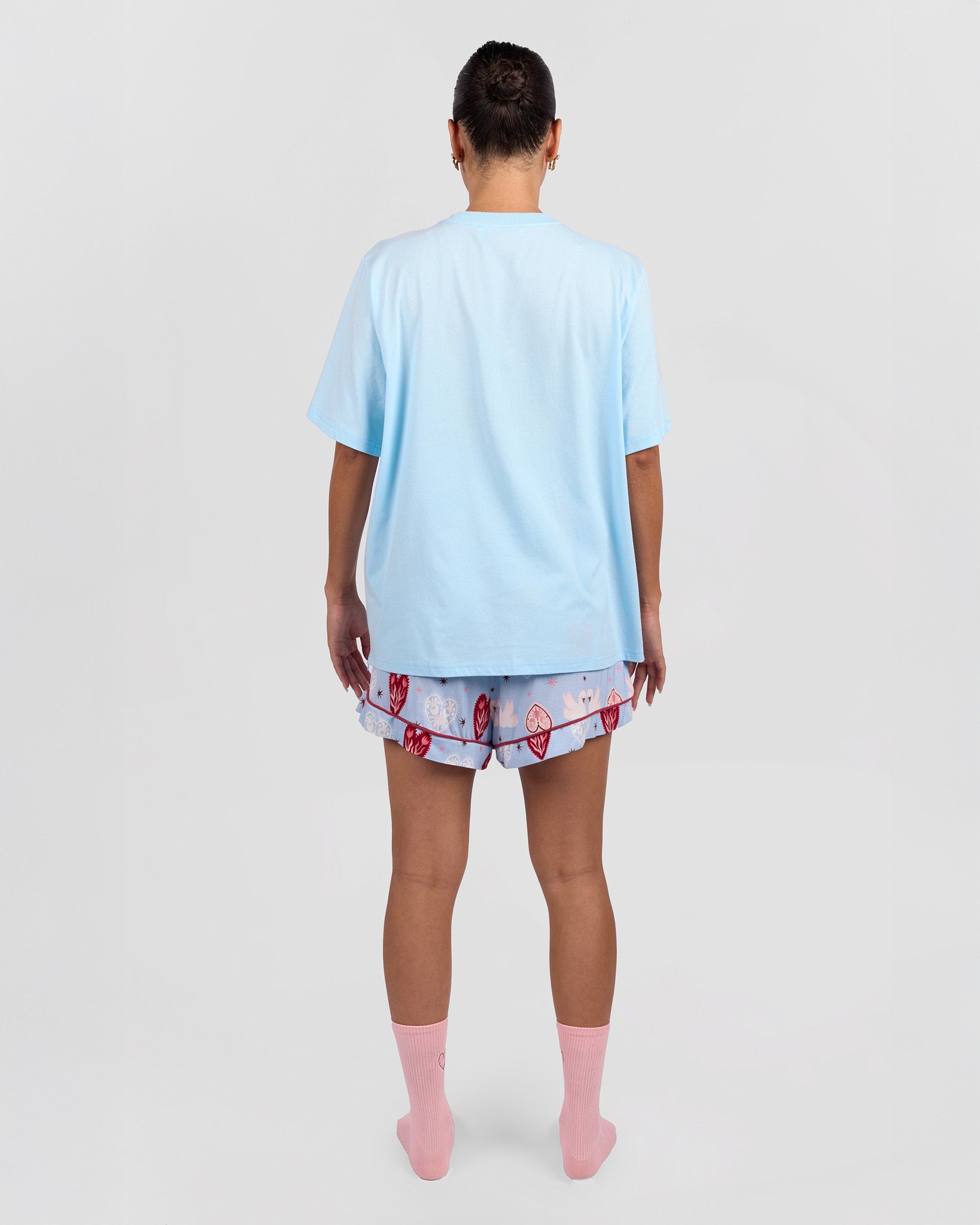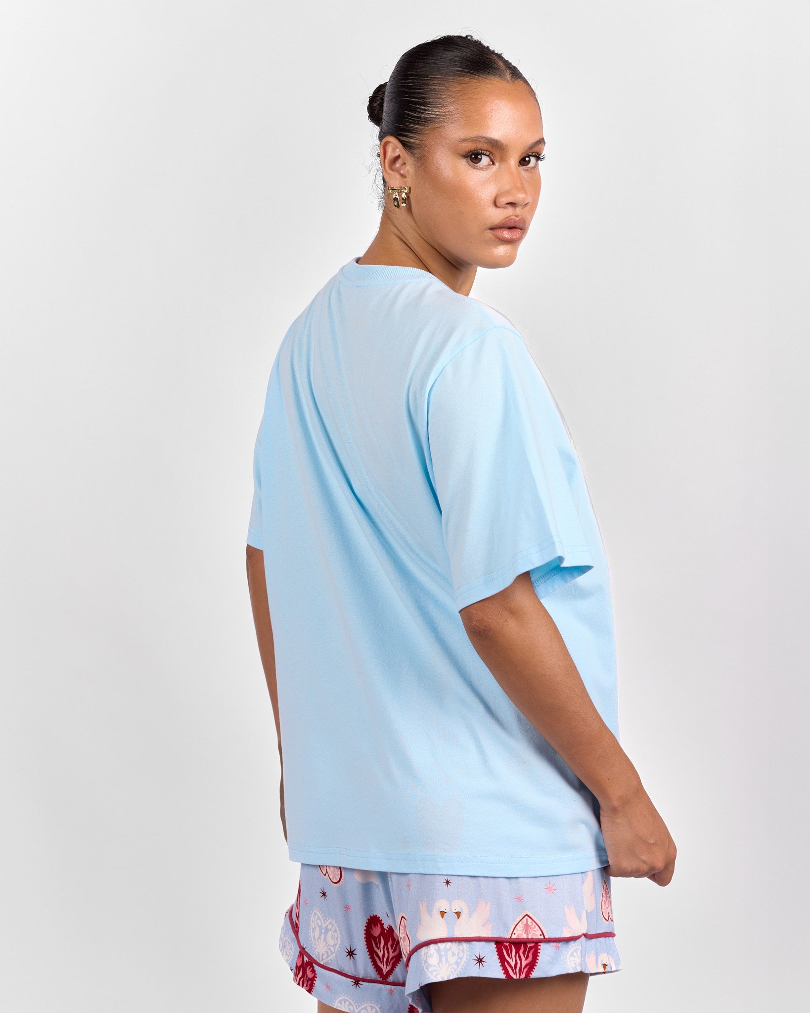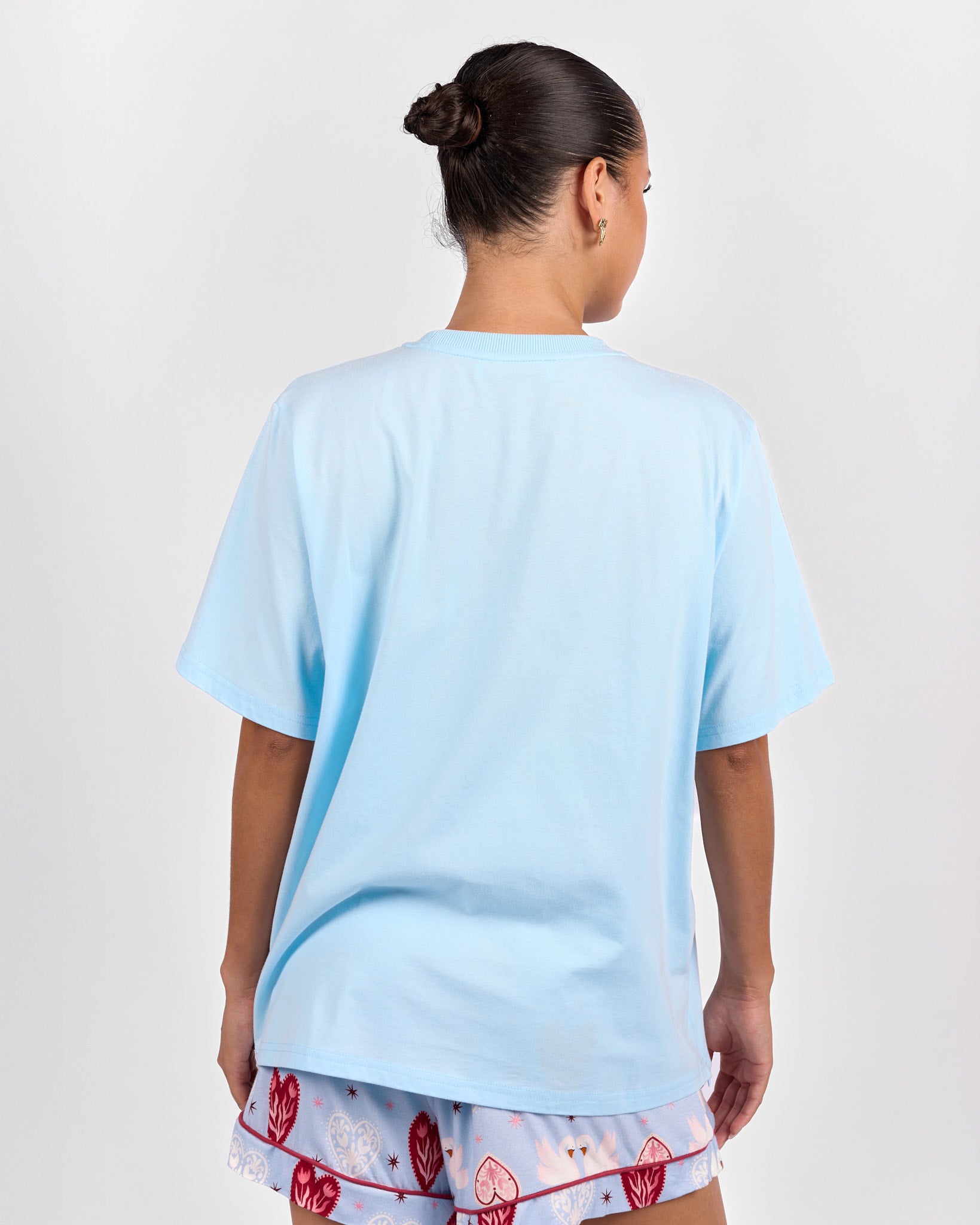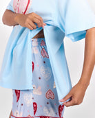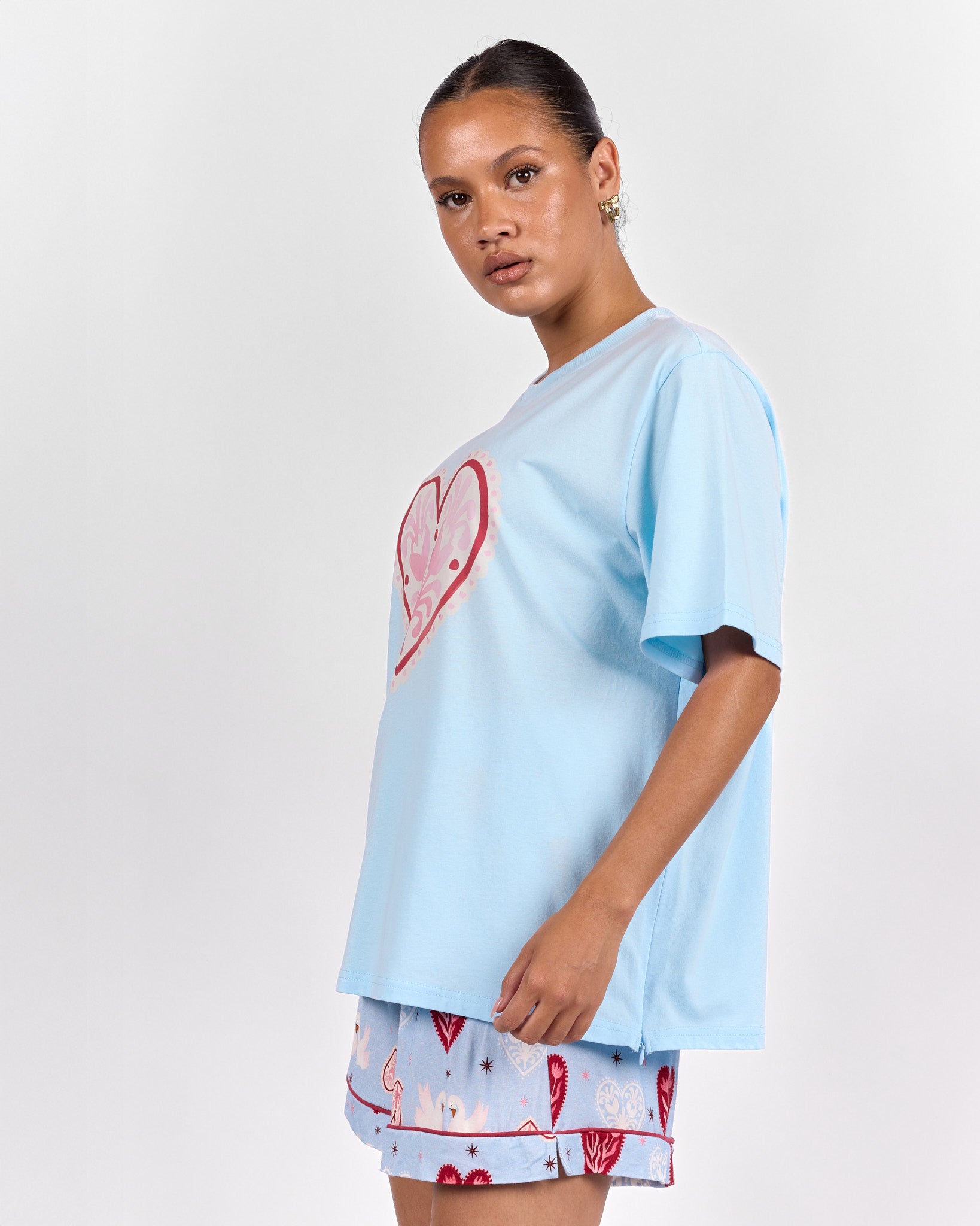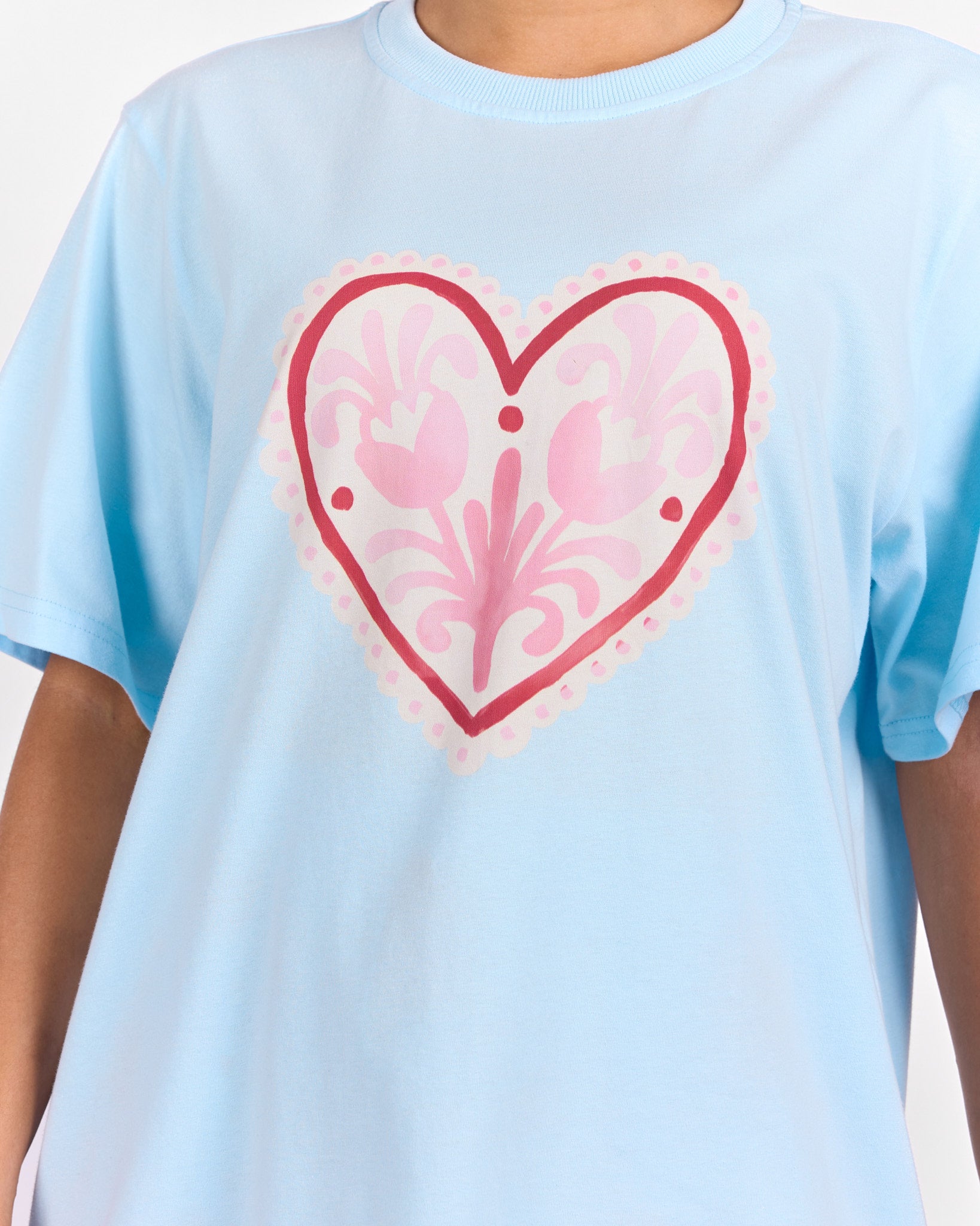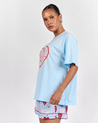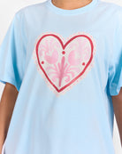 Featuring a statement heart graphic with delicate floral detailing inside, this piece blends sweetness with signature Lullaby charm. The soft blue base paired with pink and red floral elements creates a playful yet wearable design you will reach for on repeat.