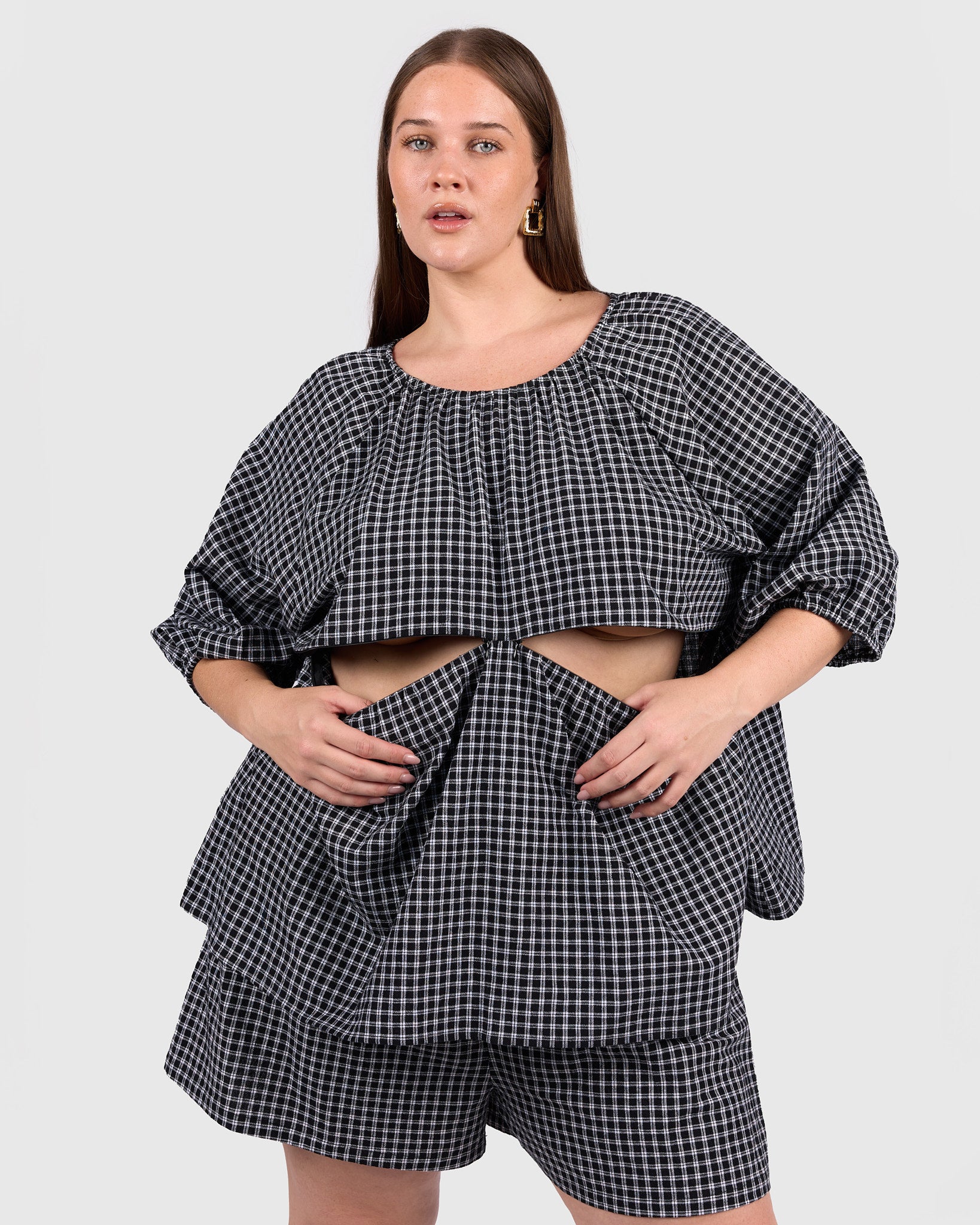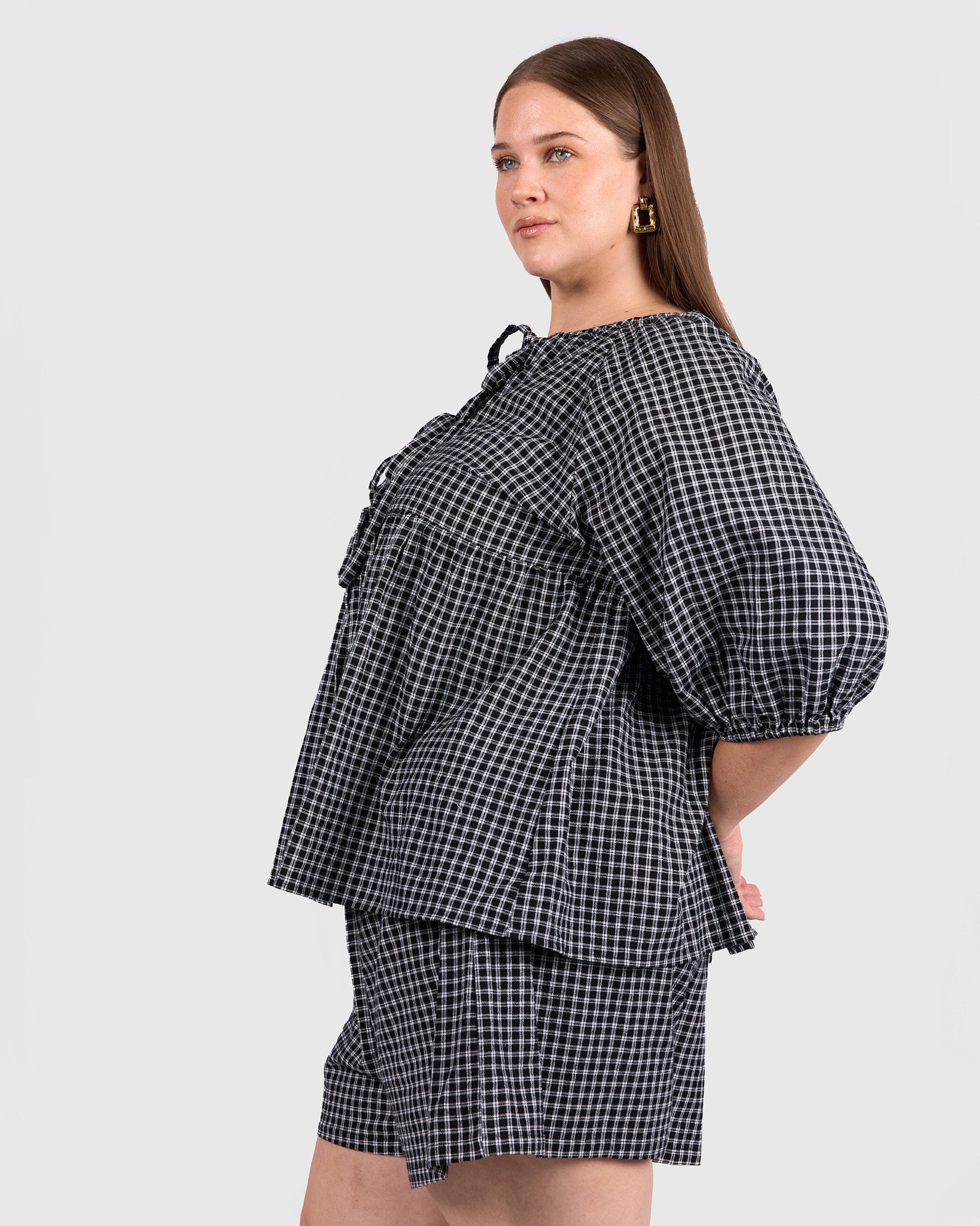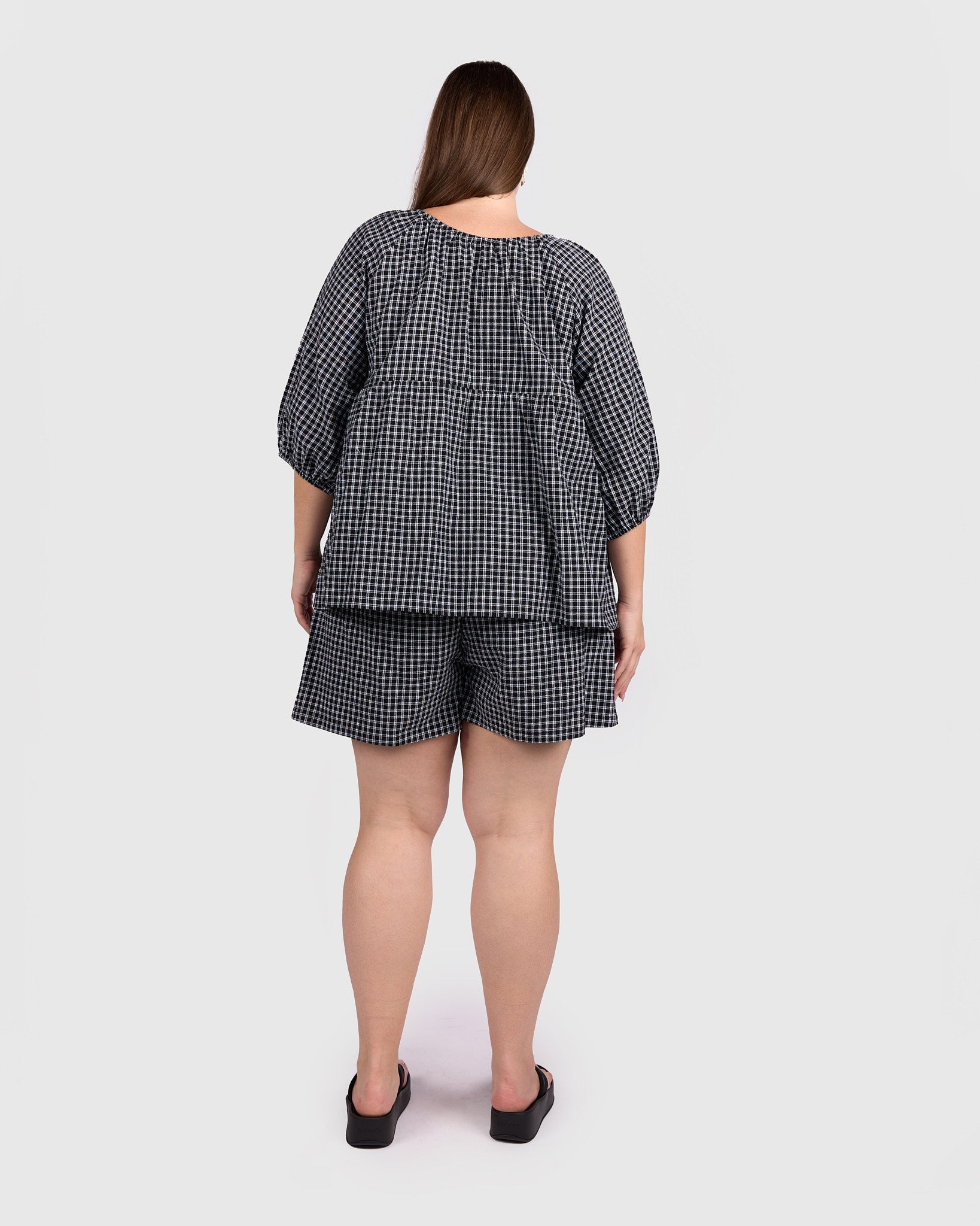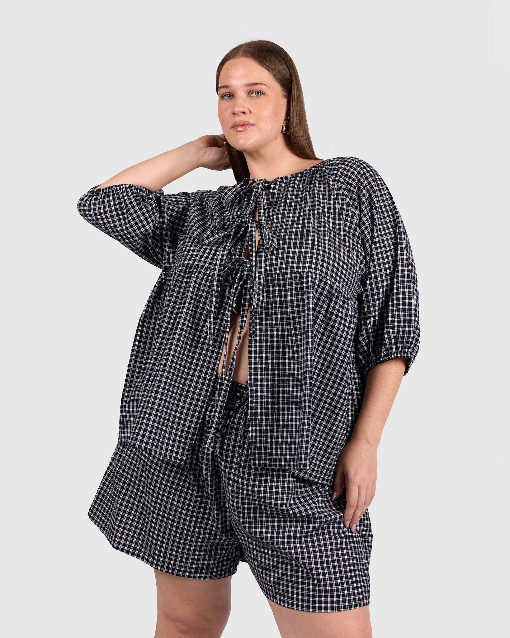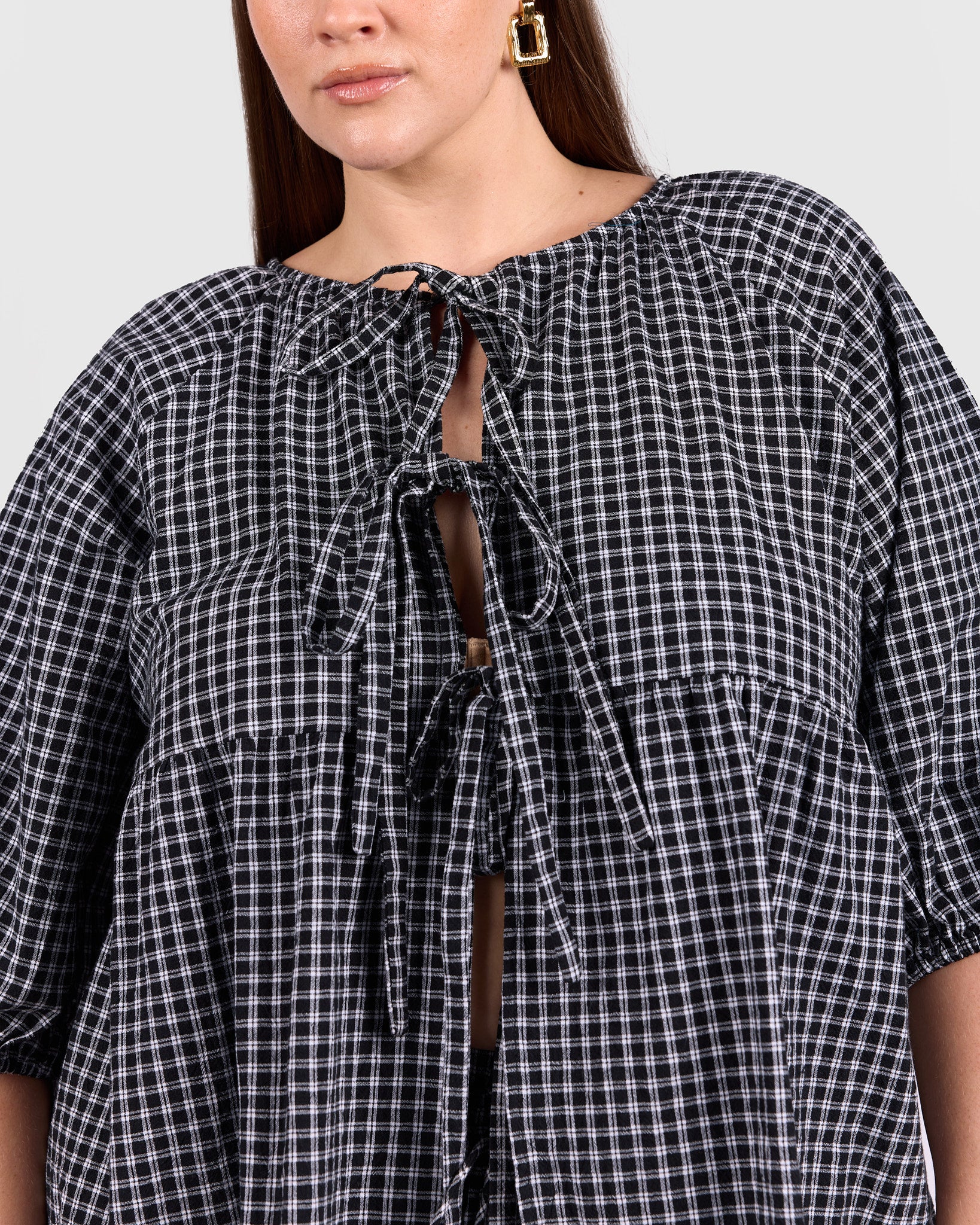 The classic black and white gingham gives this piece an effortless, wear-anywhere feel. Easy to pair with denim, wide-leg pants, or matching gingham separates, it is a staple that works across seasons.