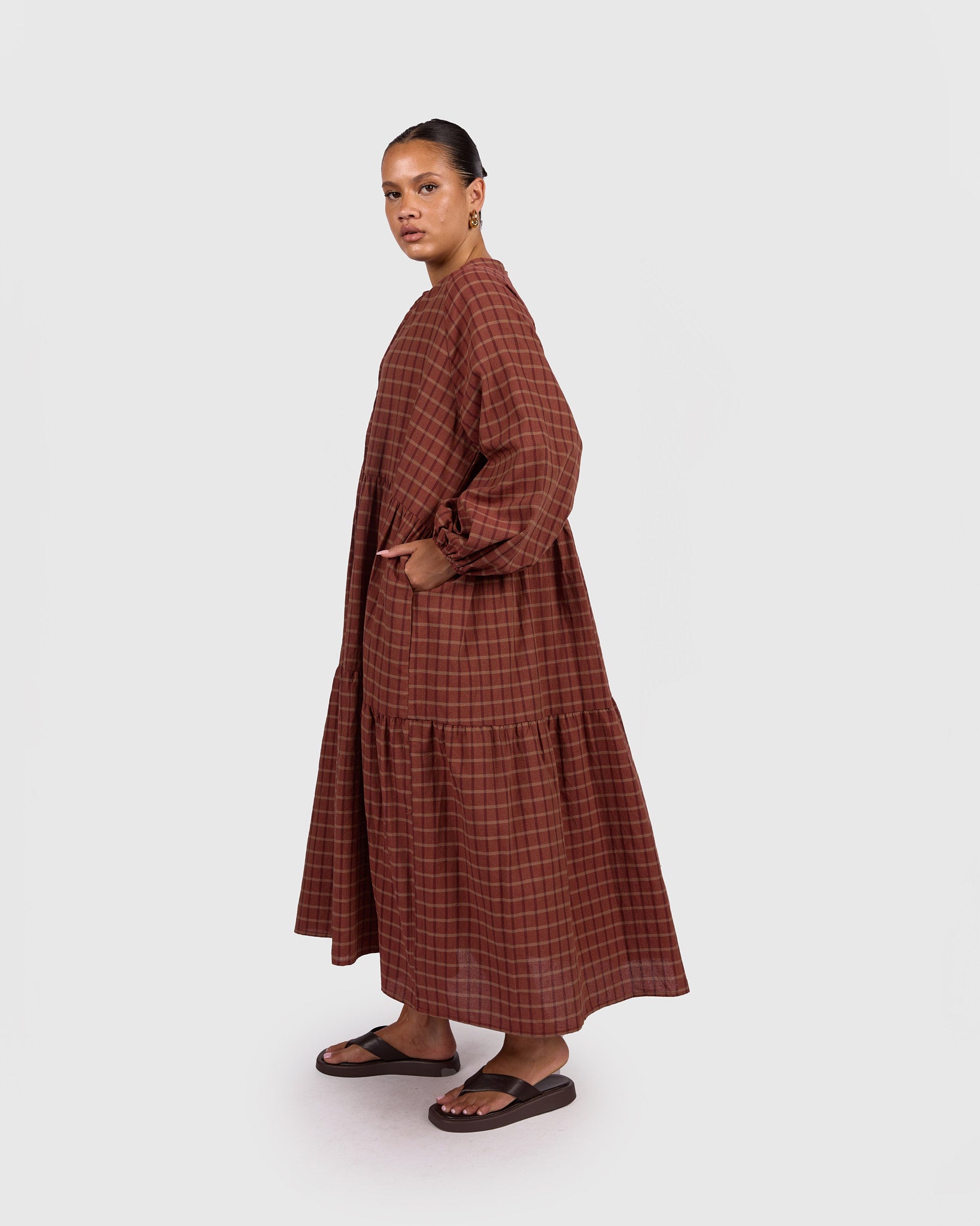 Designed with an oversized smock silhouette and billowy sleeves that move with you this maxi dress offers relaxed comfort without sacrificing shape. The button-up front with optional tie detail allows for easy breastfeeding and accessibility access, while the tiered skirt creates soft movement through the body. Finished with functional pockets, this is a dress made for real life.