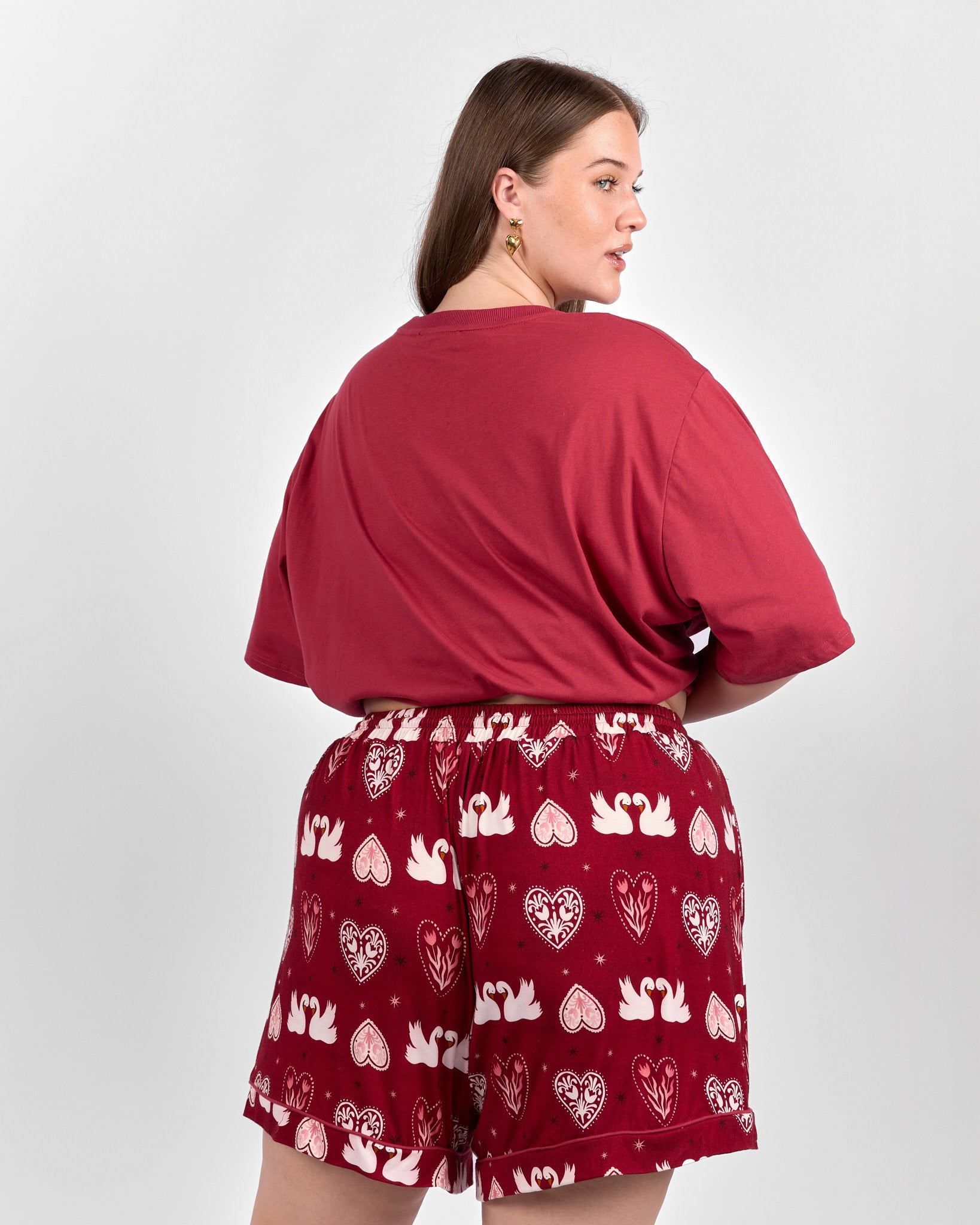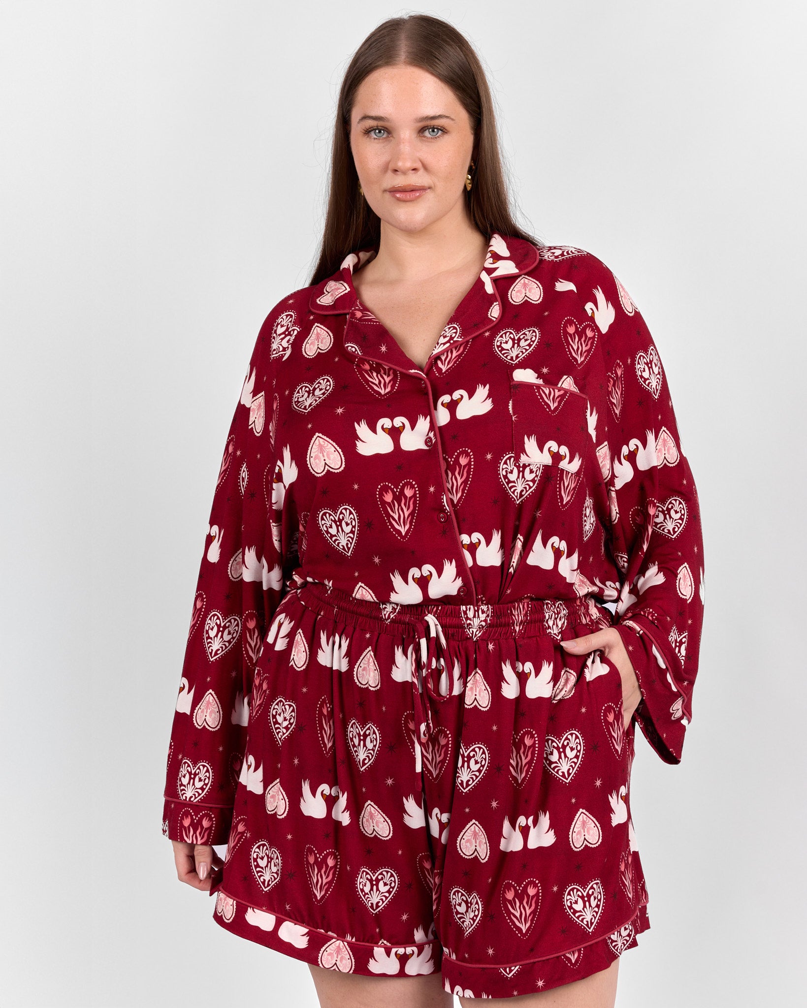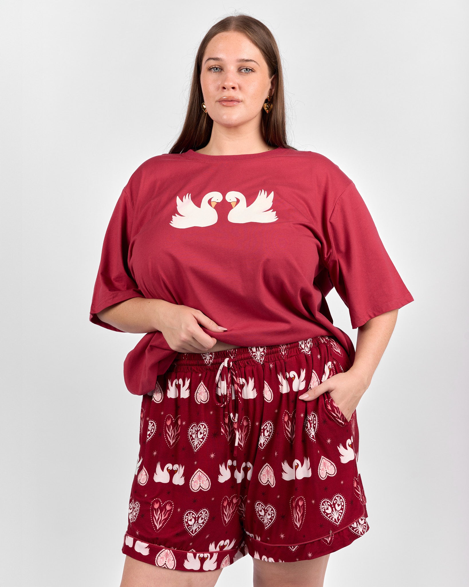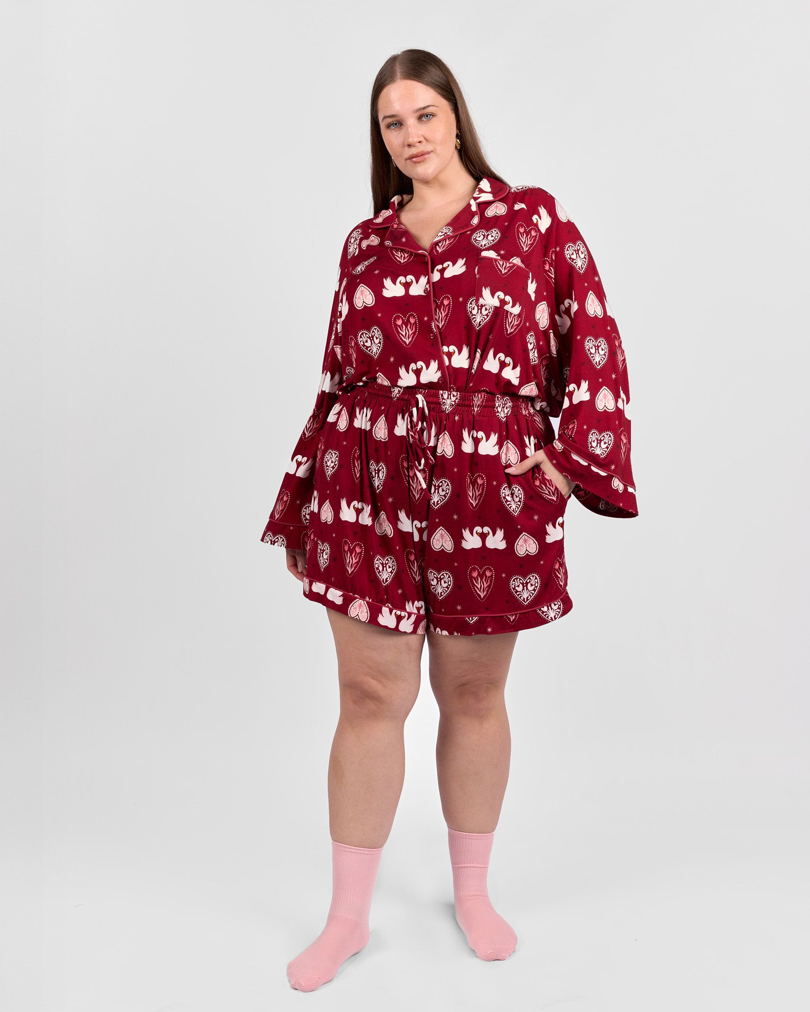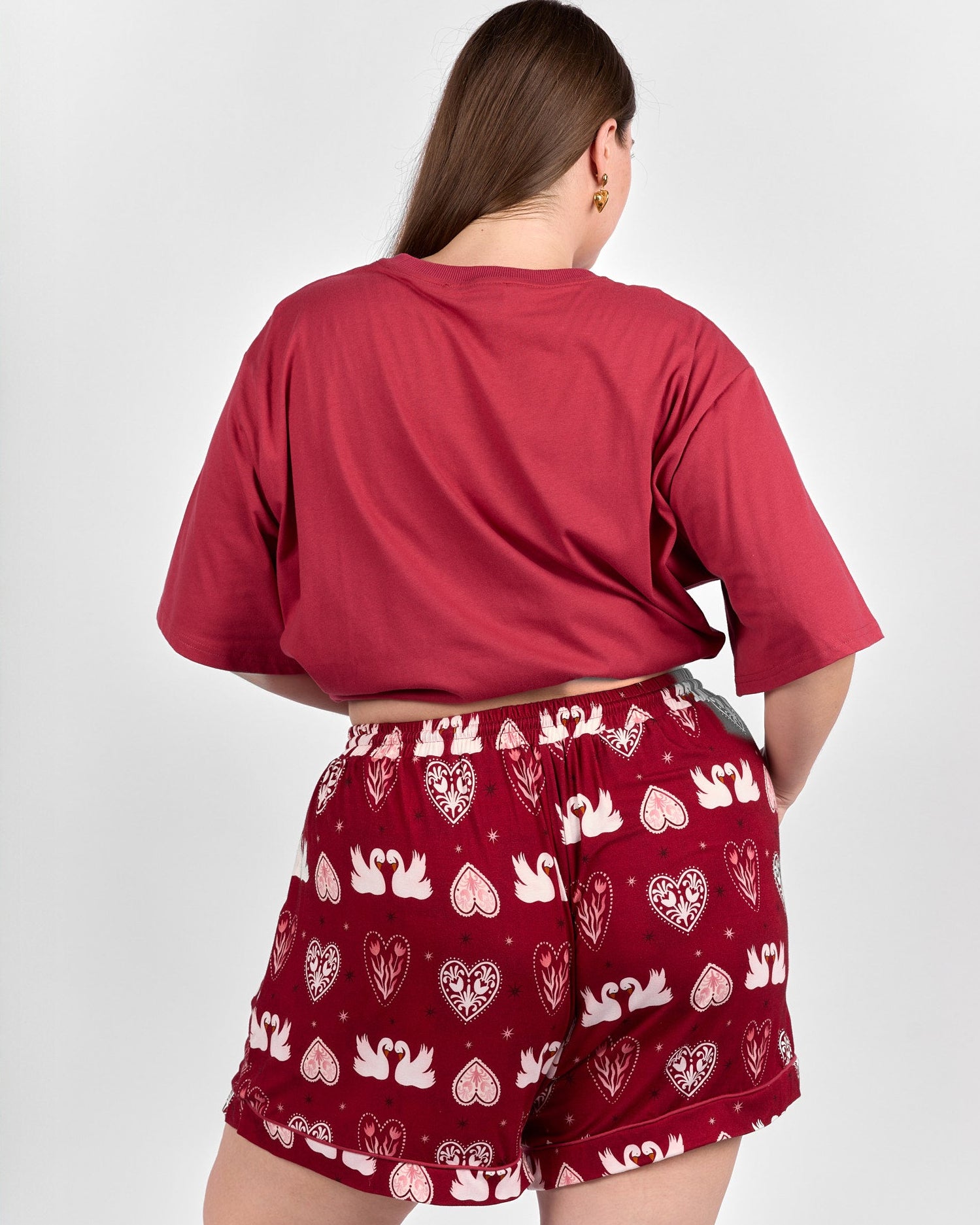 Set on a rich maroon background scattered with swans, hearts, and stars, this playful print adds a little charm to your wind-down routine. They are comfortable enough for sleeping and cute enough for lounging around the house long after you wake up.